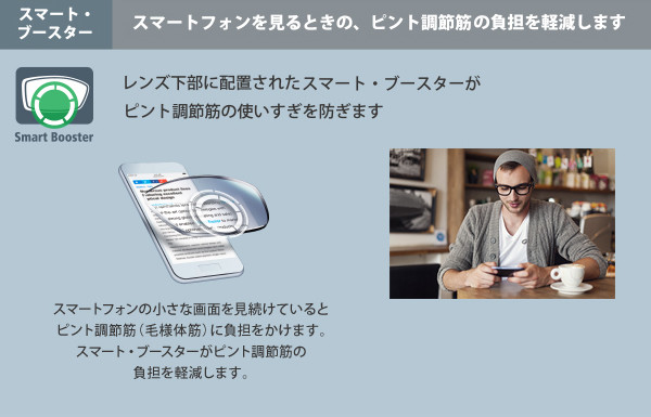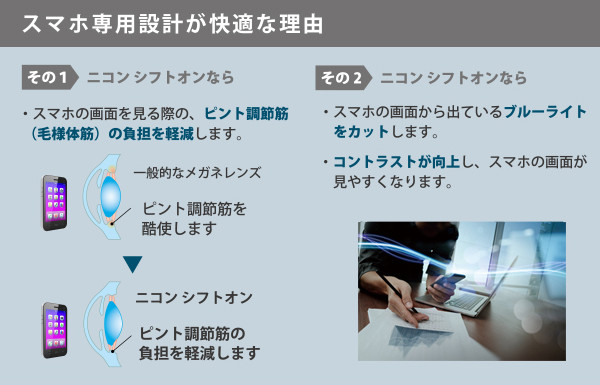 近方作業(スマホを見る)時のピント調節筋酷使の負担軽減とブルーライトカット。