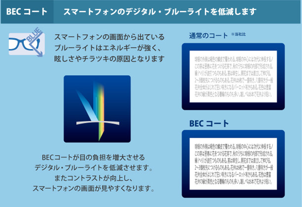 スマートフォンのデジタルブルーライトをBECコートで軽減し、目の負担を減らします。